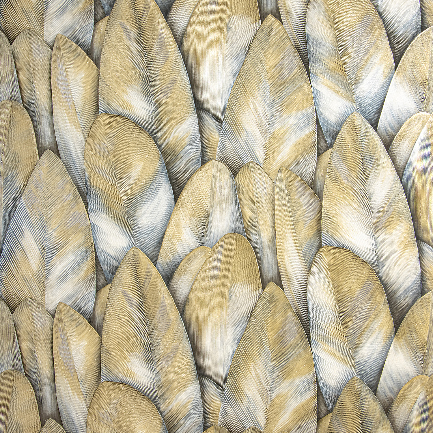 Основное полотно коллекции «Сидней»представляет собой объемные, реалистичные, переливающиеся в лучах солнечного света листья. Металлизированные краски и использование интерферента помогают создать визуально притягательный образ, передающий яркую энергетику природной красоты. Глиттер, который также задействован в декоре, добавляет дополнительное сияния и подчеркивает прожилки листвы.