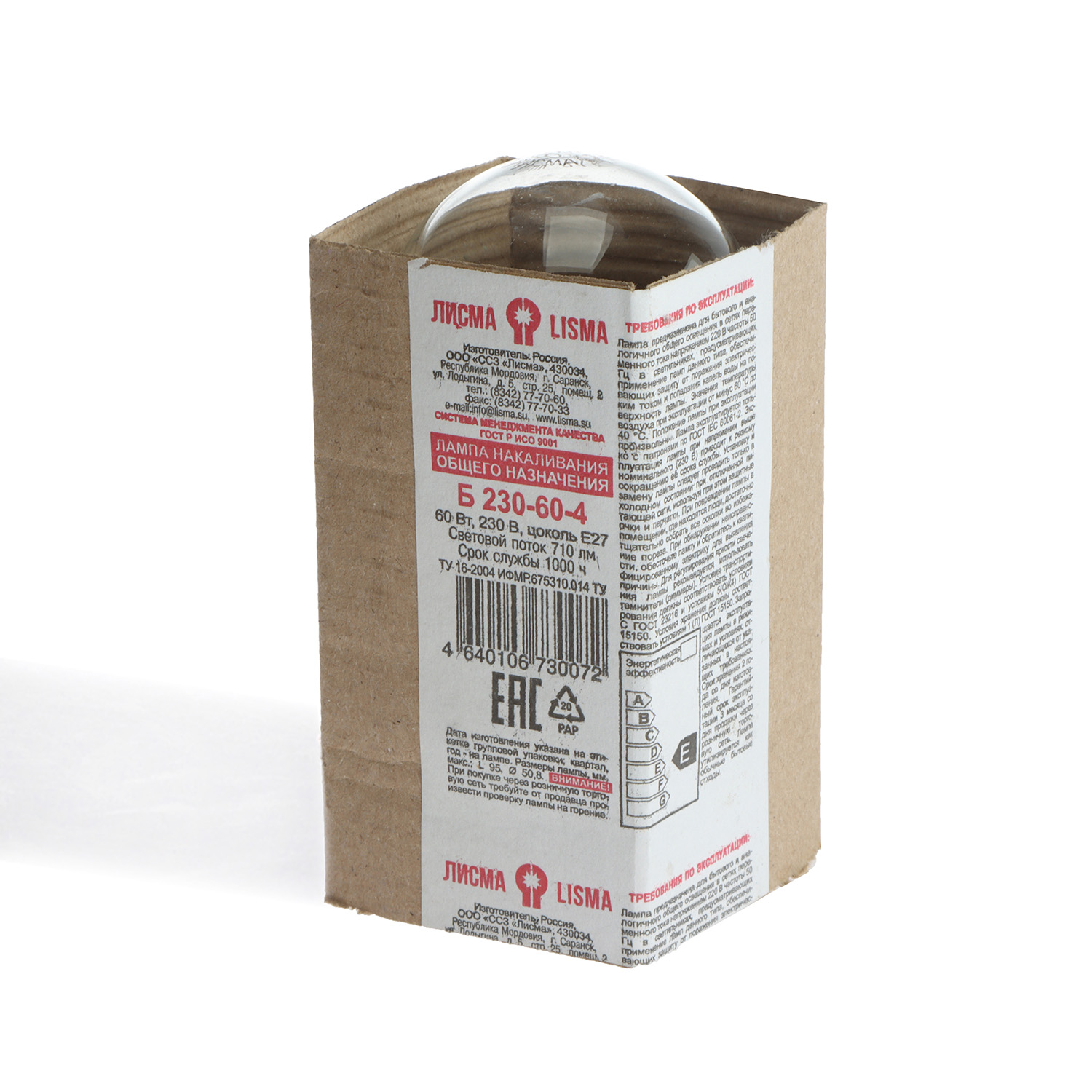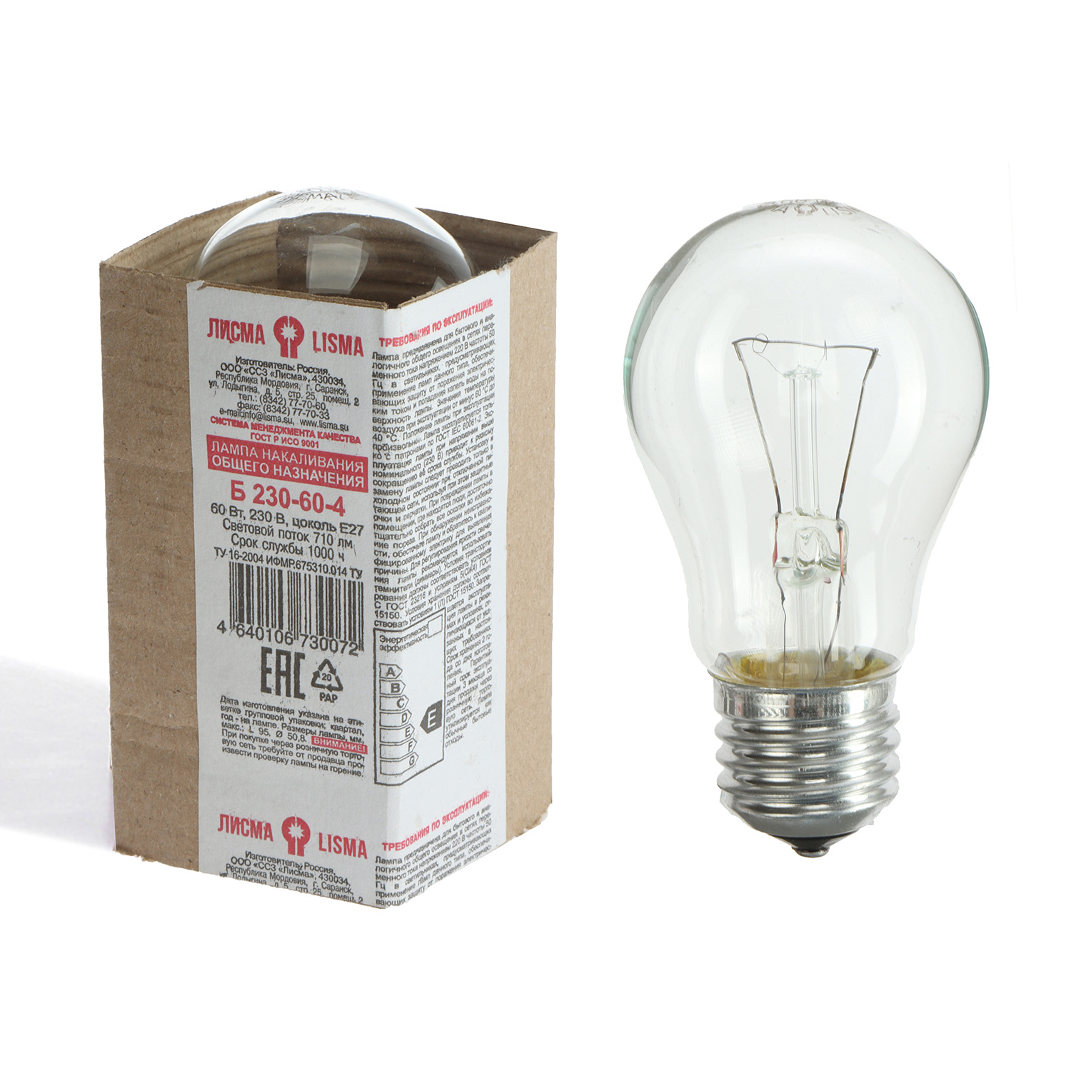 Лампа накаливания Лисма, Е27, груша, 60 Вт, 710 Лм, теплый белый свет
