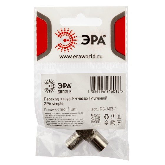 Переходник TV гнездо F - гнездо TV угловой ЭРА SIMPLE Б0048295 *10/50