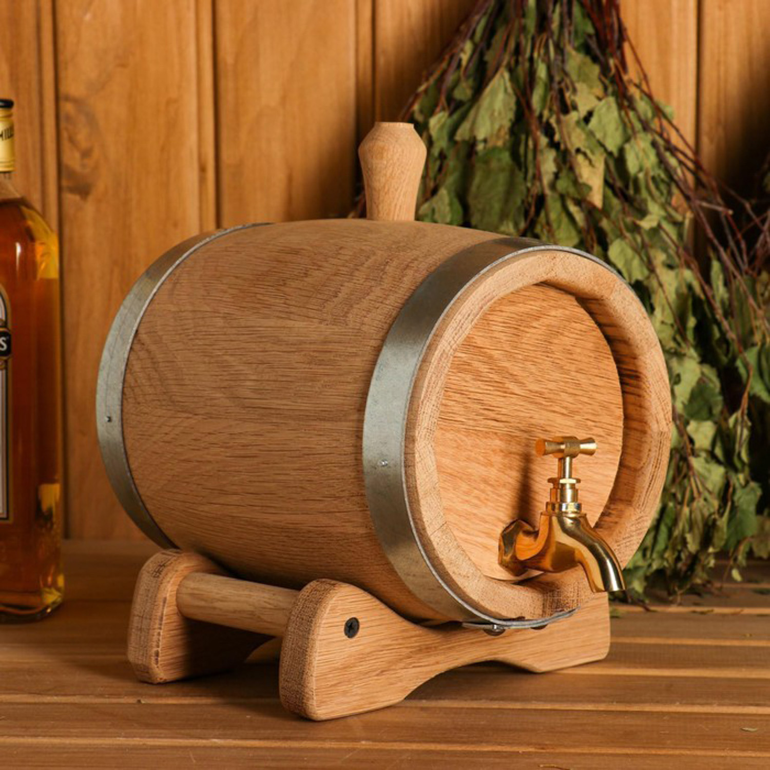 Бочка дубовая на подставке, 1,5л, металлический обруч, кран из латуни 4606515