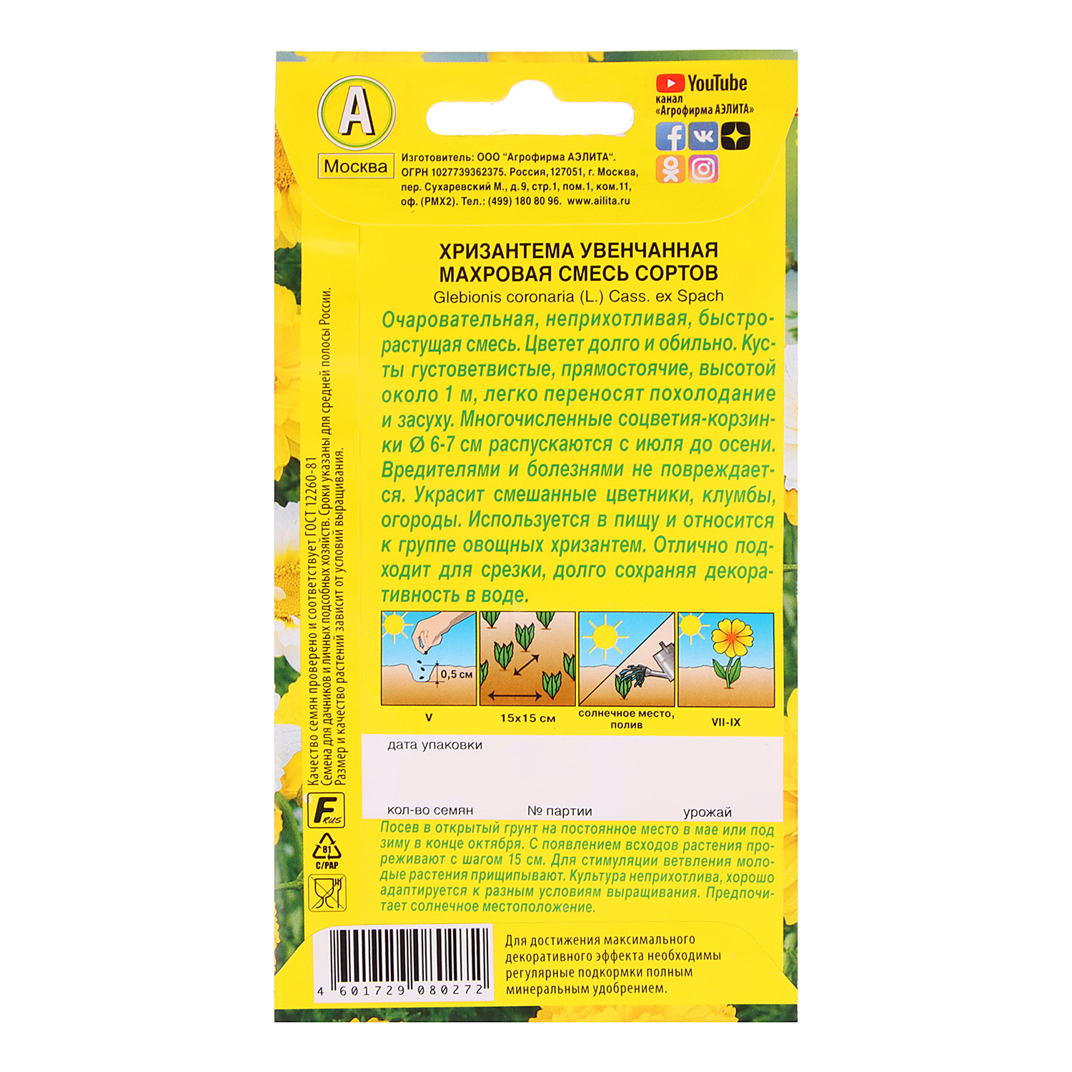 Семена Хризантема Махровая смесь увенчанная 0,2гр Аэлита цв *10/200