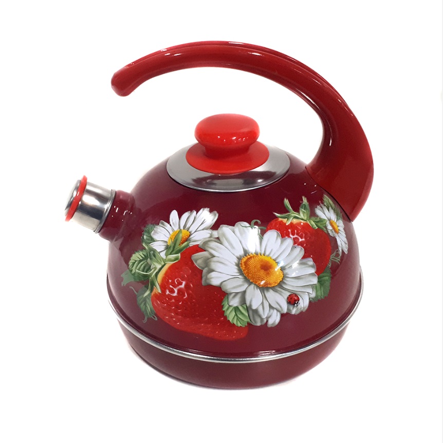 яяяЧайник эмалированный со свистком 3,5л декор "Клубника с ромашкой" Бордовый Т04/35/01/05/Н13	 *1/4