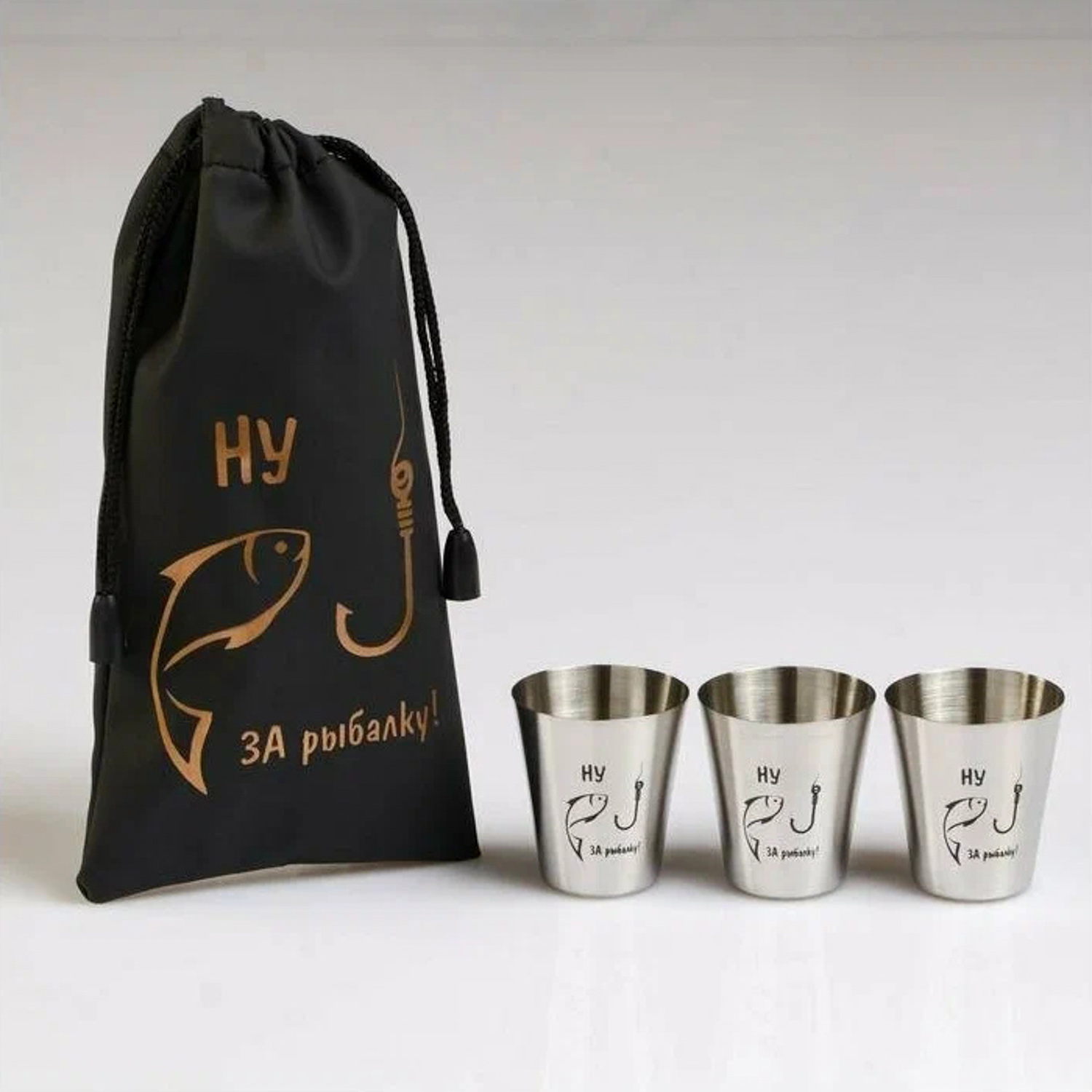 яяяНабор стопок, серия: 23 Февраля, "Ну, за рыбалку" в мешочке, 3 шт × 30 мл, стопка 4 х 3.5 см 5215117
