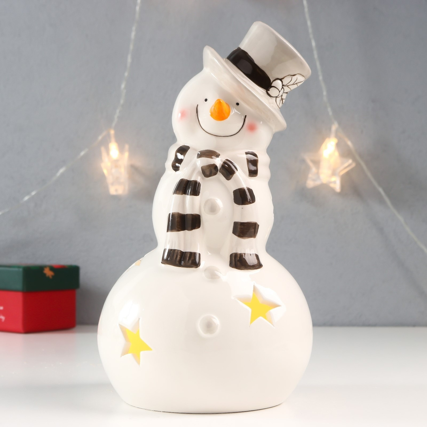 Сувенир керамика свет "Снеговик в бежевом цилиндре и полосатом шарфе" 22х12,5х12,5 см 7620342